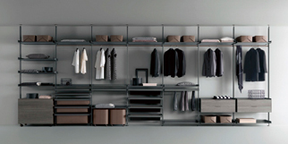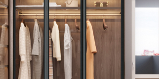 L型开放式铝制转角衣帽间,选用窄边拉丝金极简玻璃门和浅蟹灰金边通顶门板。。。